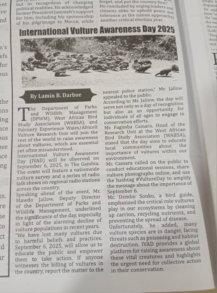 A 21-day nationwide survey led by the Department of Parks and Wildlife Management (DPWM), with support from Barry Macdonald, Luce Green, and the Africelt team, alongside Amadou John (WABSA) and Dembo Sonko, recorded strong vulture activity across the country.